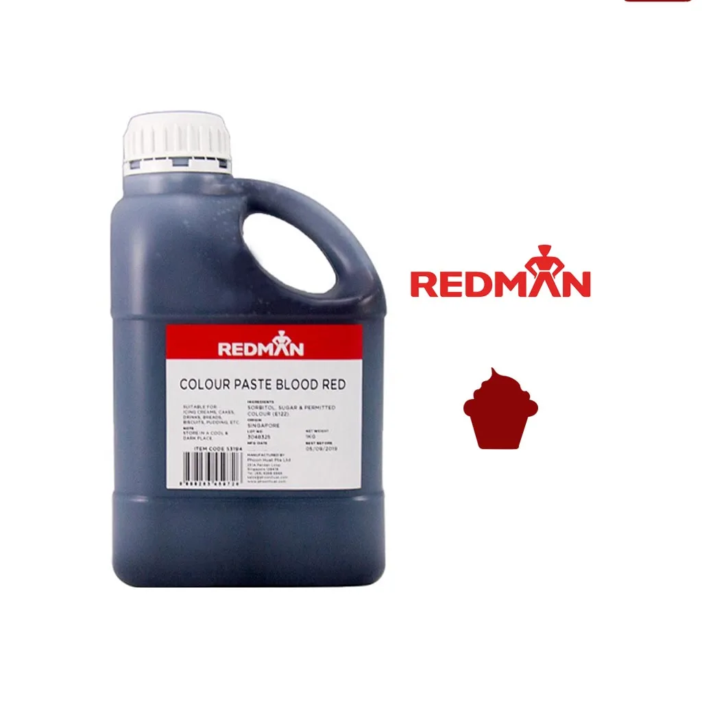 Edible Food Colour Paste Blood Red Jar of 1kg by RedMan. Blood Red Jar colour paste used colouring icing, royal icing, cake mix, sponge, buttercream and more!
