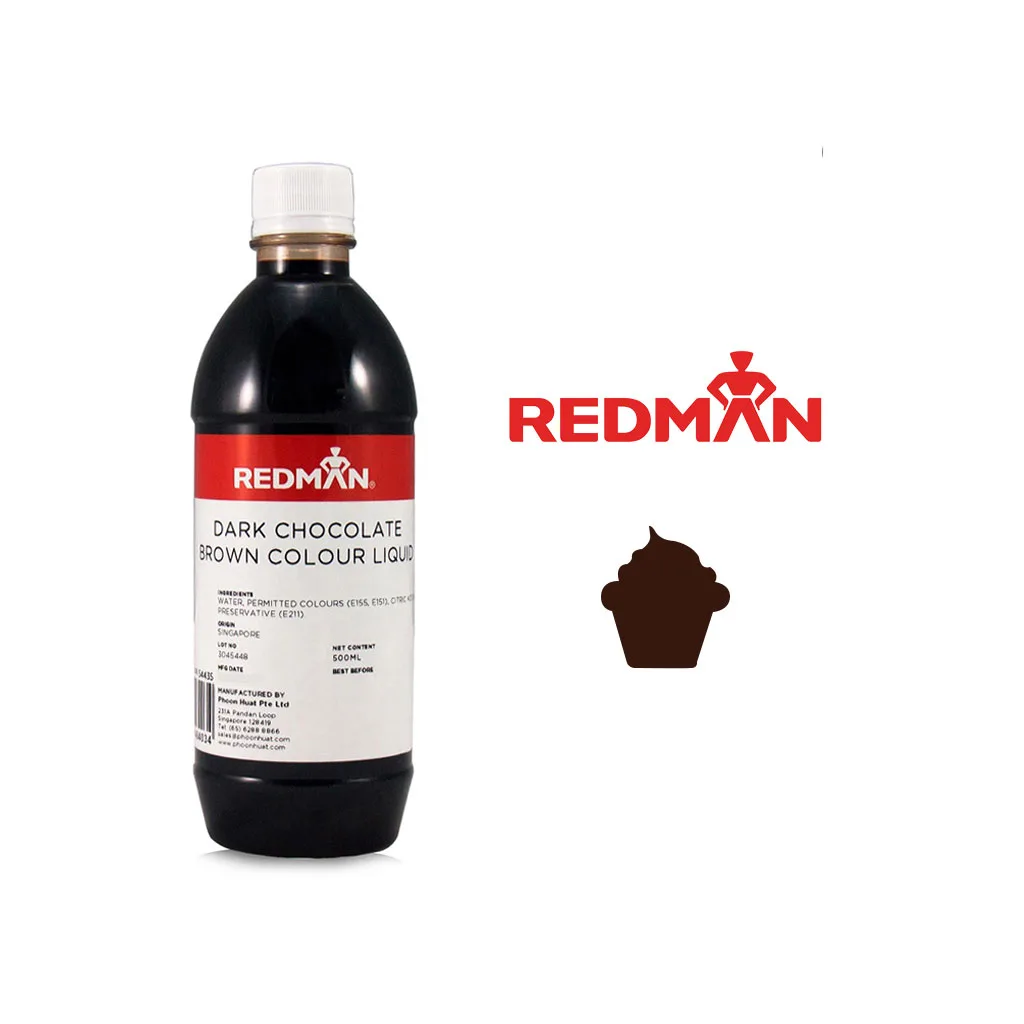 Edible FoodColour Liquid Dark Chocolate Brown Bottle of 500ml by RedMan. Dark Chocolate Brown colour liquid used for coloring, brushing or airbrush on cakes & pastries.